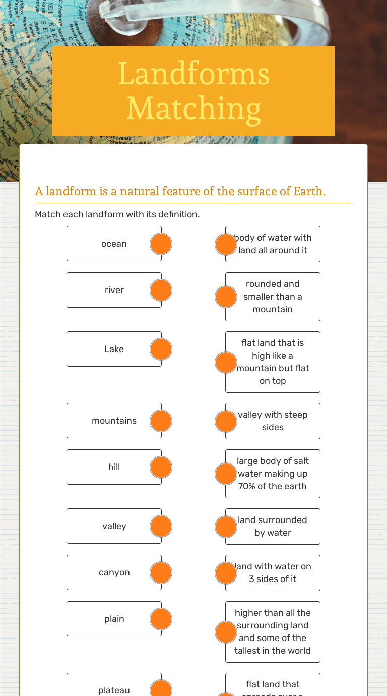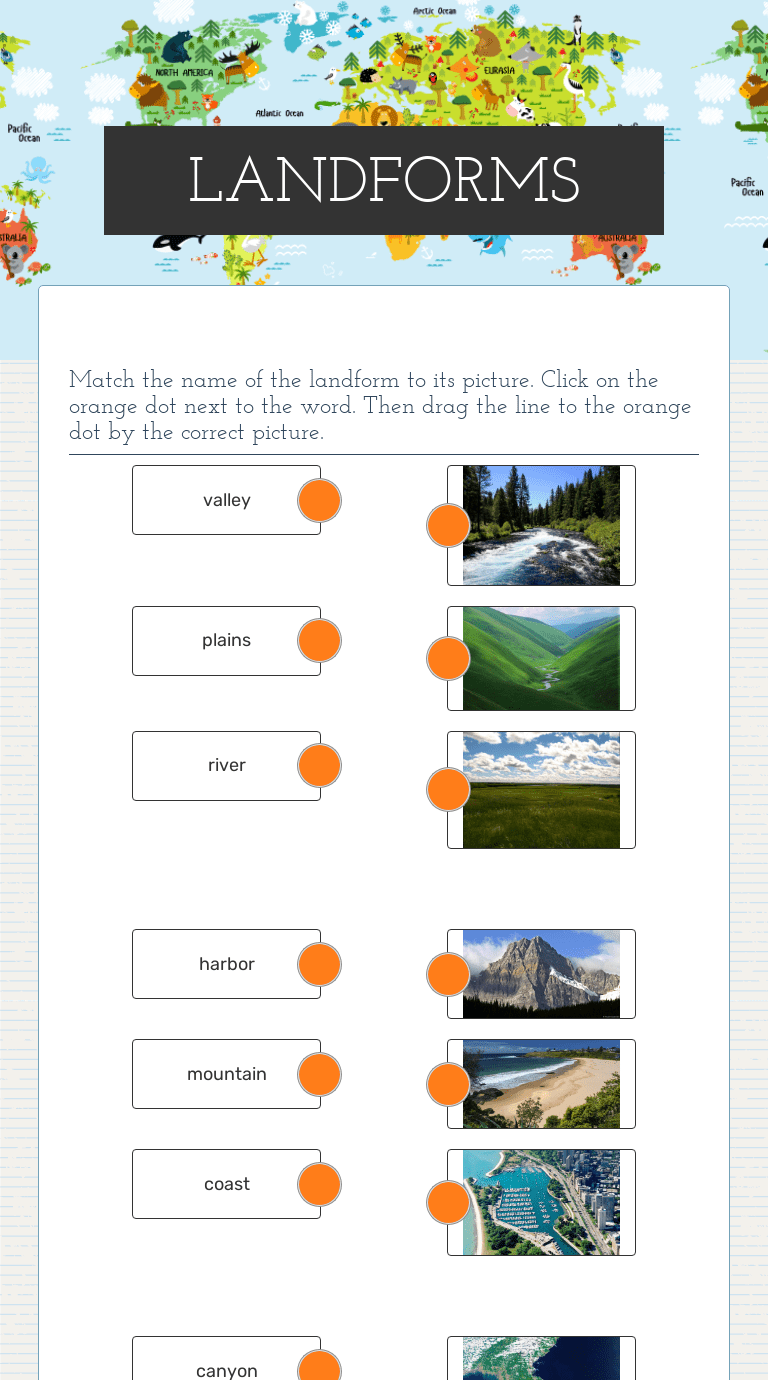 Students read the words and draw a line to match them correctly to the . Students will try to collect matching pairs of landforms including . Navigate through these major landforms and bodies of water printable worksheets featuring exercises like identification, labeling, matching, landforms . With eight landform examples, students have to match . Subtracting, alphabet matching, letter recognition, i spy games, .